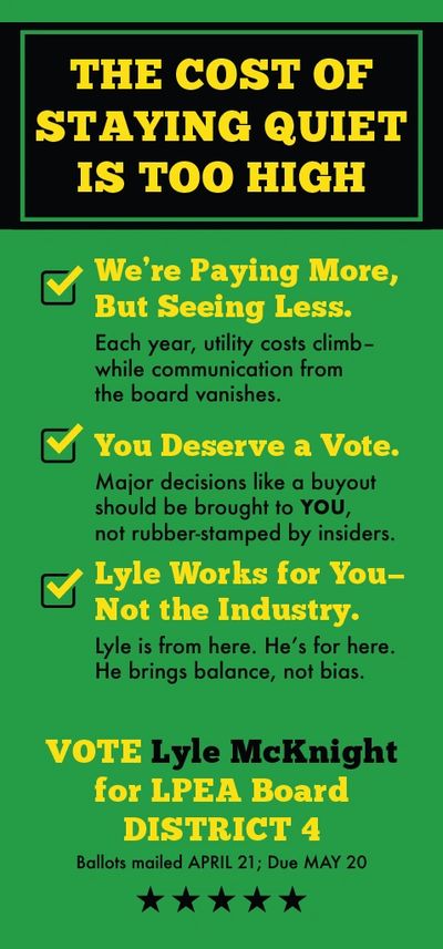 The cost of boardroom decisions made without your input is too high. Lyle is dedicated to restoring balance by keeping the co-op under local control—with no industry ties and no hidden agendas—so that every decision benefits the people of District 4.